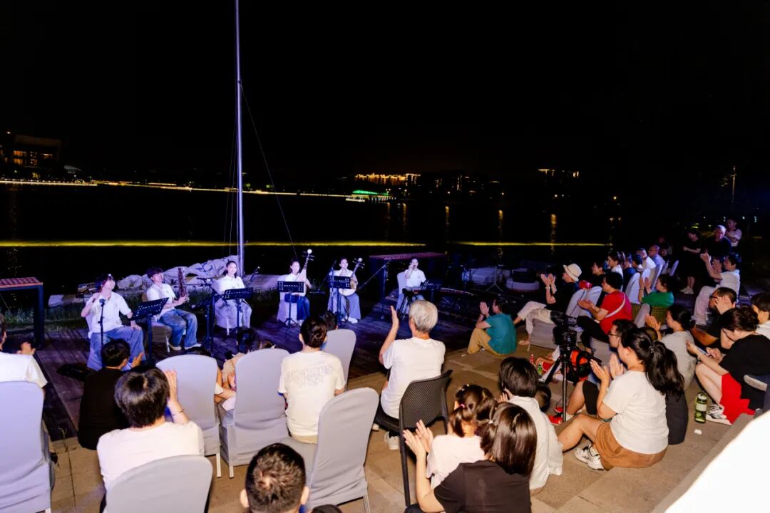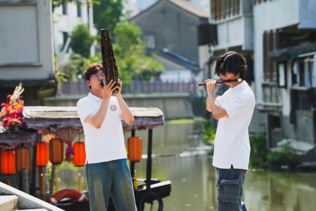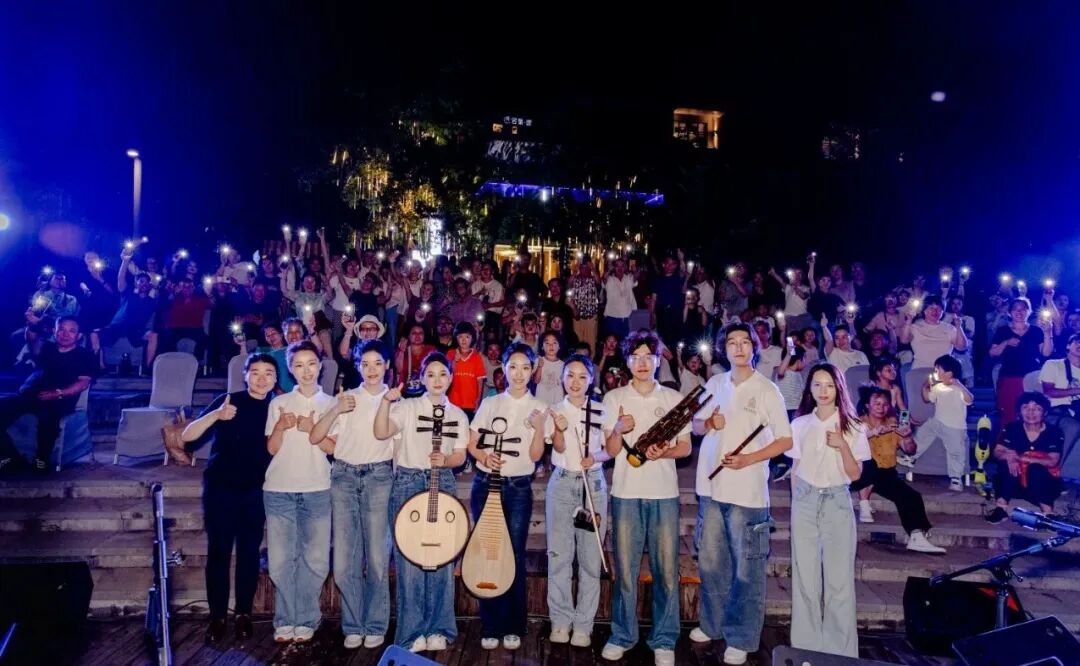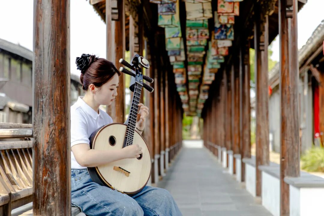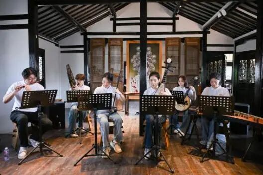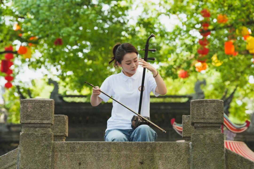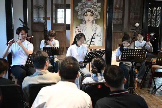 在泗泾古镇非遗戏曲音乐嘉年华系列活动“泗泾有戏”开幕式上,民乐系学生演绎《筝韵江南映泗泾——蓝》。作品由民乐系博士生导师、上海浙派筝艺市级非遗传承人罗晶教授指导。演出结束后,学生与观众面对面交流。