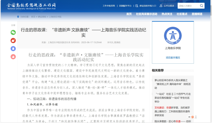 活动恰逢2025年“文化和自然遗产日”上海启动仪式,民乐系系主任、作曲家刘灏教授创编“十锦细锣鼓”新曲,由实践团学生们与非遗传承人合作演绎,并在启动仪式上发布。