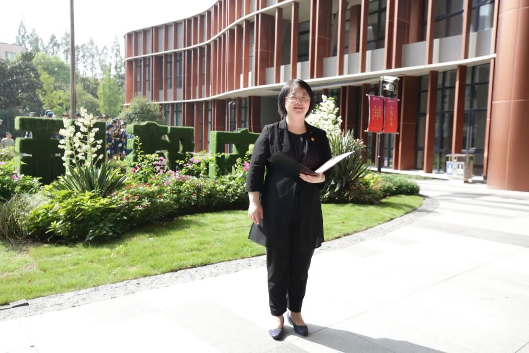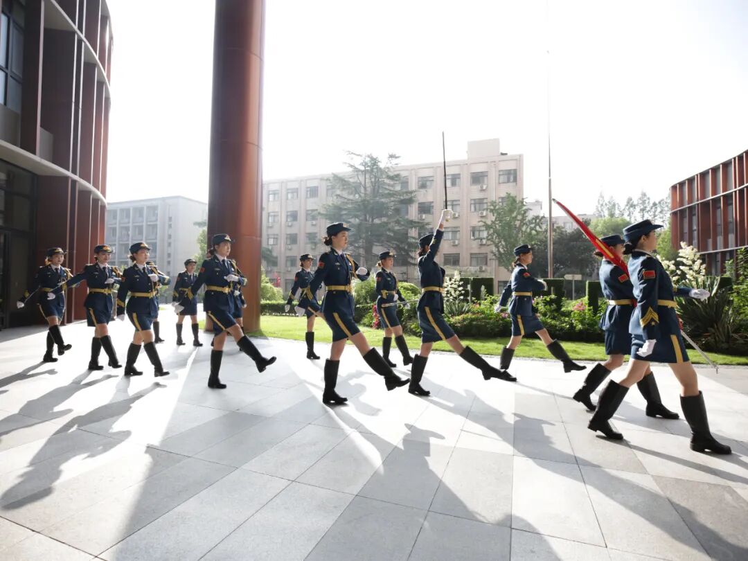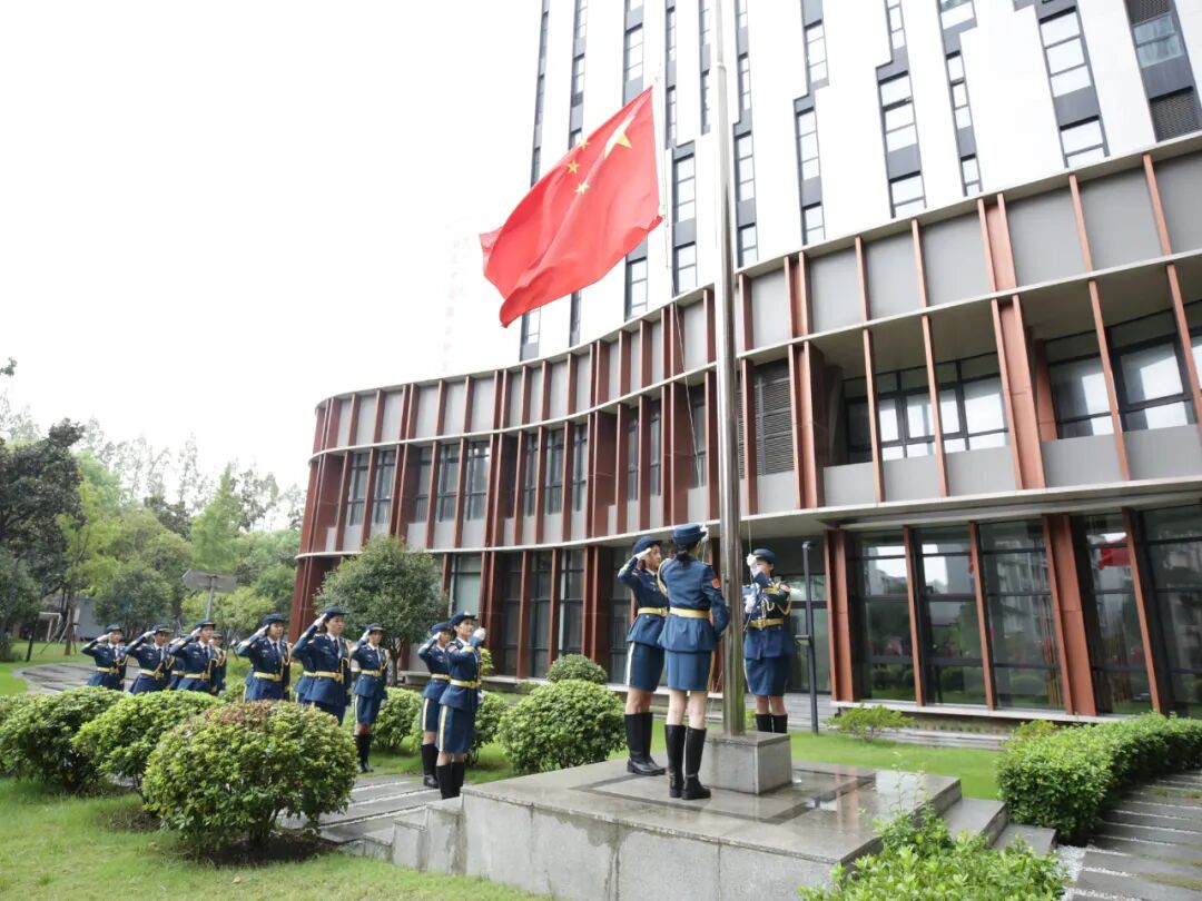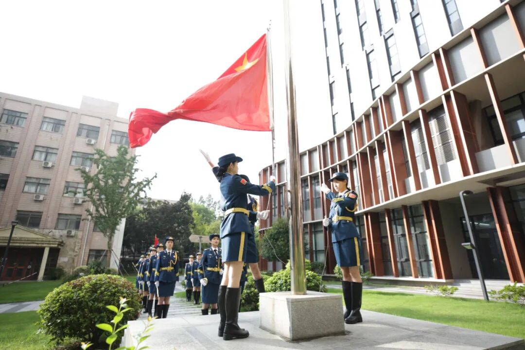 仪式正式开始。上音国旗护卫队迈着铿锵步伐护卫国旗入场。这是上音首支全女子队列,由12名二级院系学生组成。伴随着《义勇军进行曲》激昂的旋律,鲜艳的五星红旗冉冉升起。全体师生肃立行注目礼,齐声高唱国歌。歌声嘹亮,穿透高耸的教学大楼,传递着上音人的赤子之心。