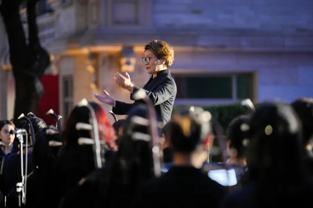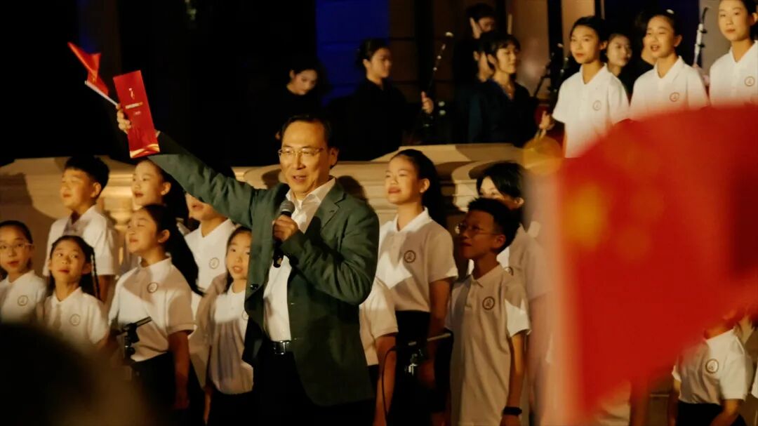 在指挥家程晔的执棒下,50余人的上海音乐学院交响管乐团以一曲气势恢宏的《红旗颂》拉开序幕,瞬间点燃现场的爱国热情。