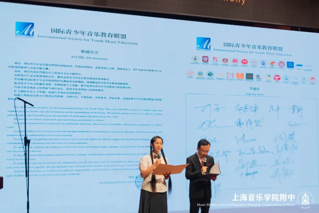 上音附中学生代表季沁姚瑶庄严宣读《联盟宣言》,宣示了联盟“以音乐为桥、以教育为翼”的共同愿景。