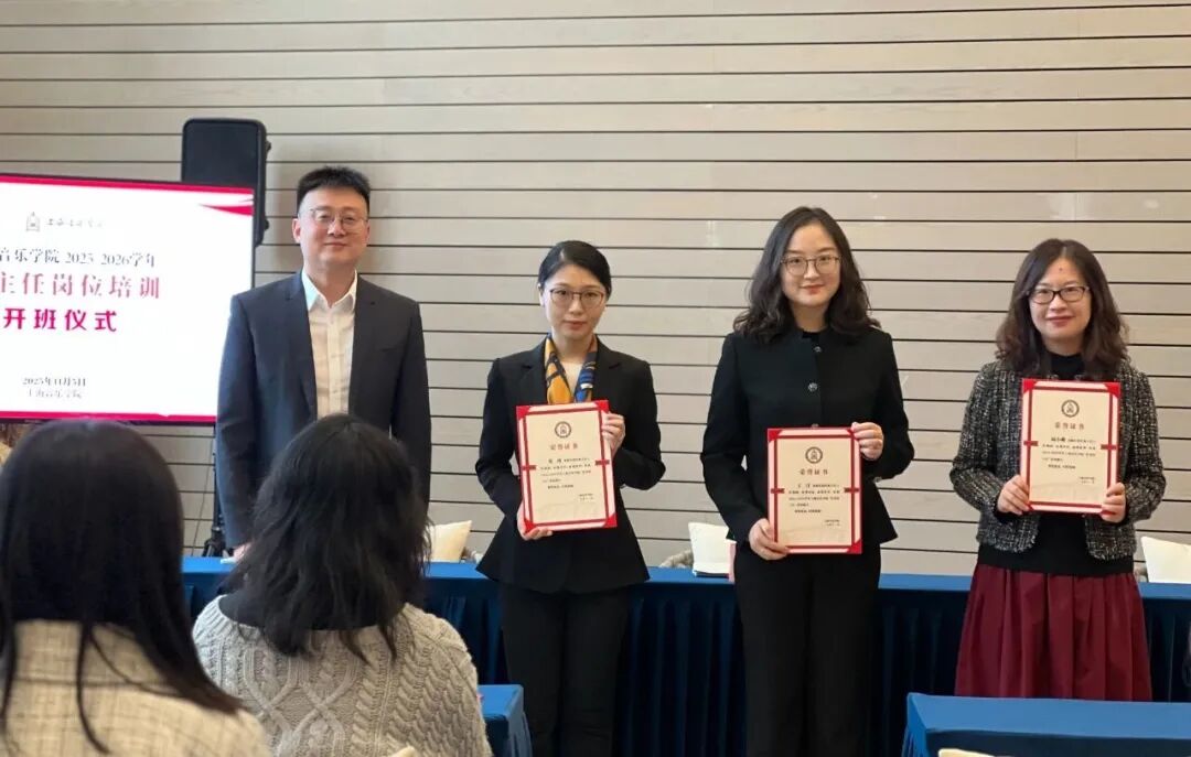 汤隽杰为荣获2024-2025学年上海音乐学院“优秀班主任”荣誉称号的三位教师颁发荣誉证书。党委教师工作部部长谢苗苗为第四届上海音乐学院“班主任主题班会”的获奖教师代表颁发荣誉证书。