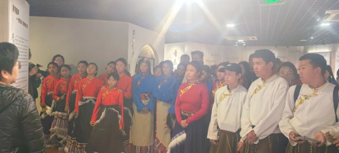 上音援青教师胡骏(左四)和果洛州历史上首位考入上音、现就读于声歌系本科的麻切仁措(左三)向东方乐器博物馆捐赠由果洛州书法协会会长更增撰写的果洛州非物质文化遗产果洛德昂洒智藏文书法作品参观上音校史馆