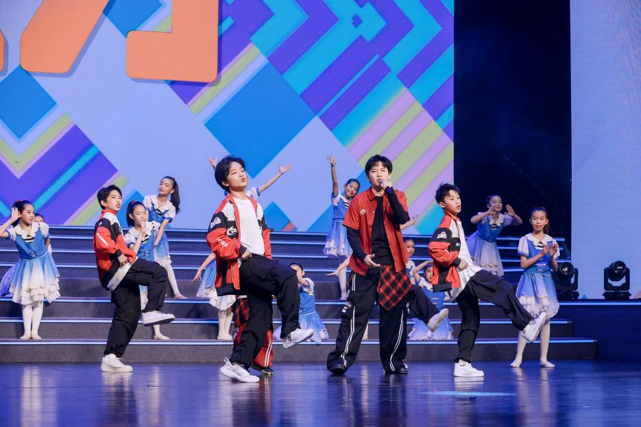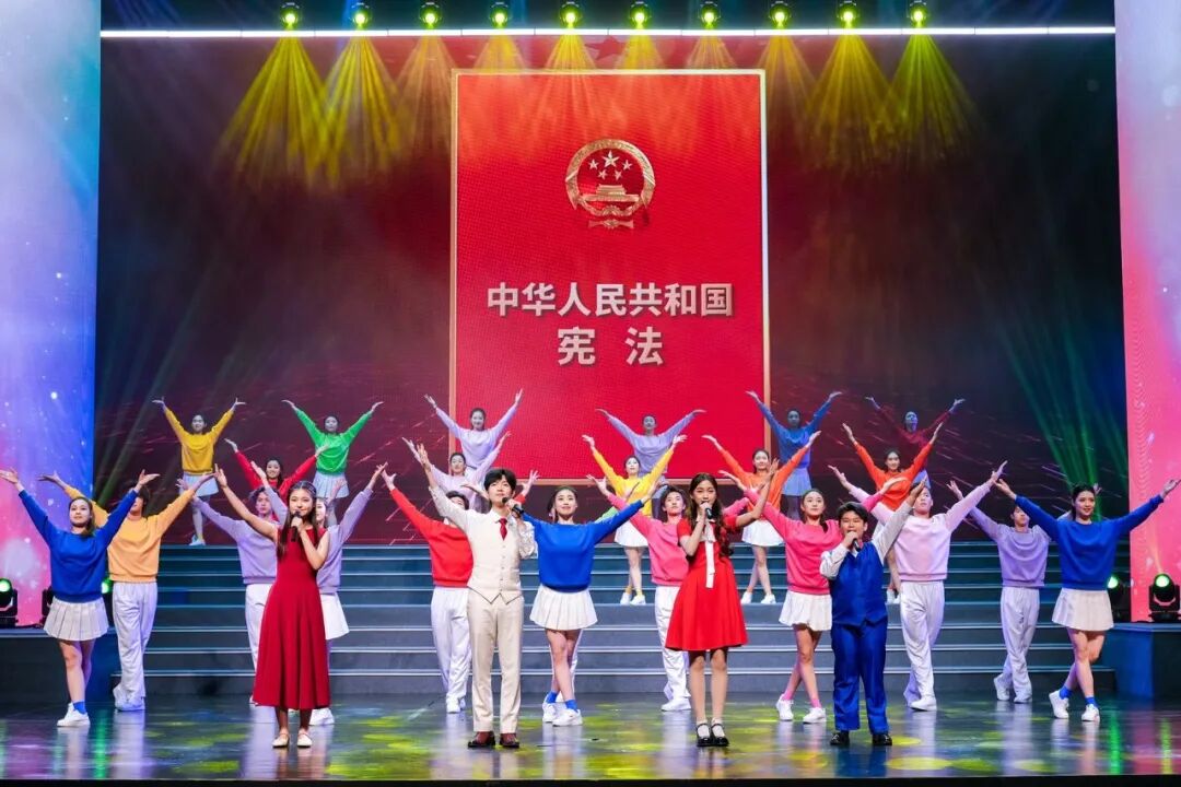 第三篇章“法治筑梦 薪火相传”结尾,音乐戏剧系赵子桢、张凌恺与孩子们共同演绎歌曲《宪法伴我成长》,温暖的歌声与童声交融,生动刻画了宪法如挚友般陪伴青少年成长的画面。