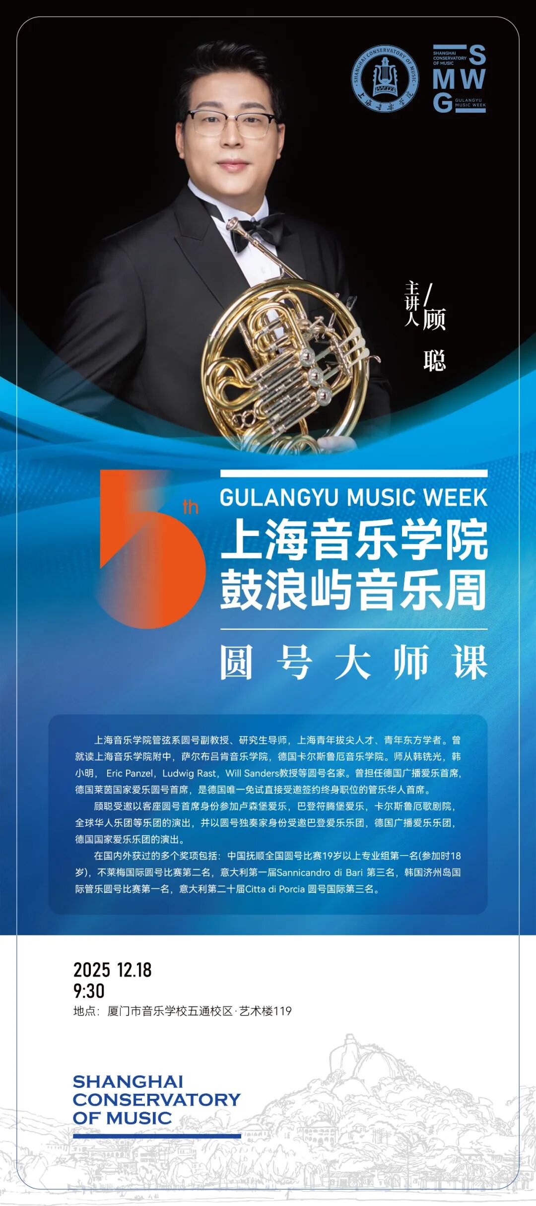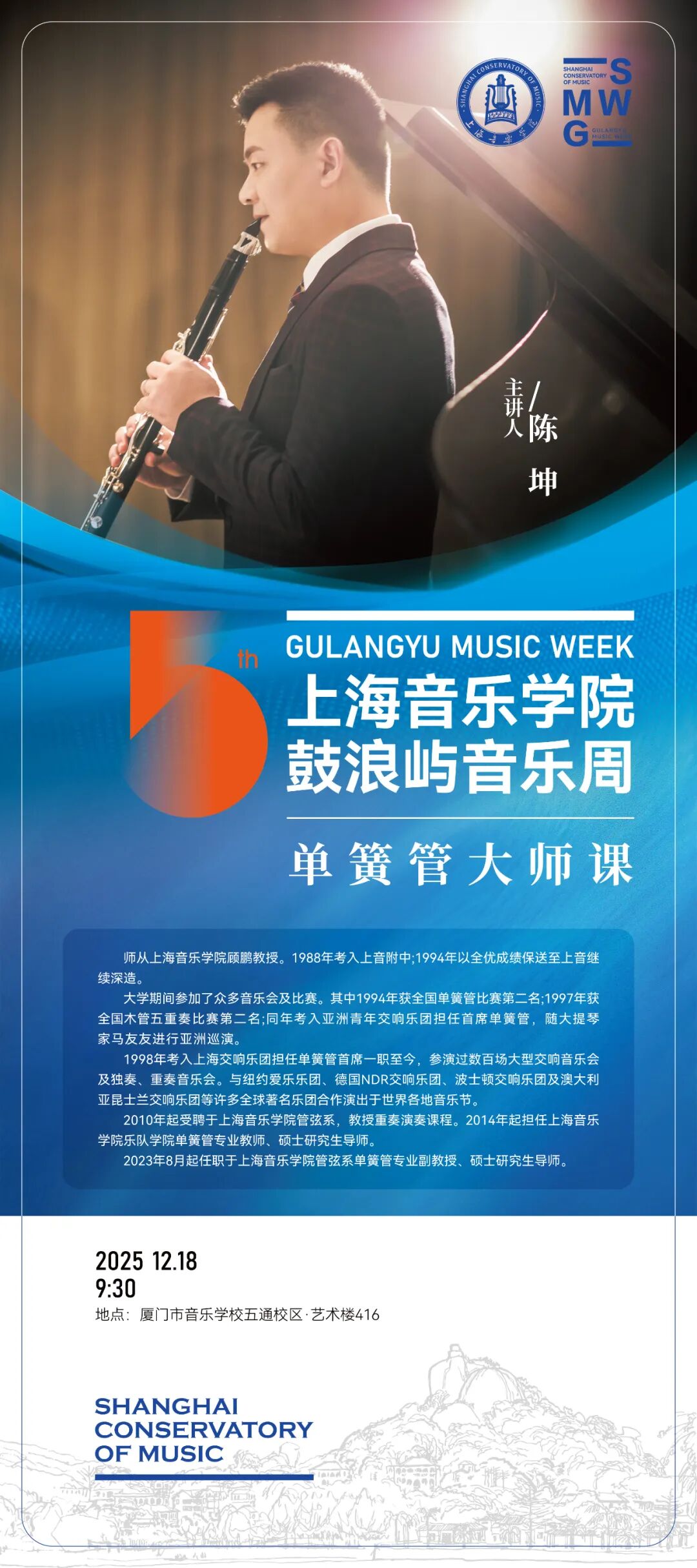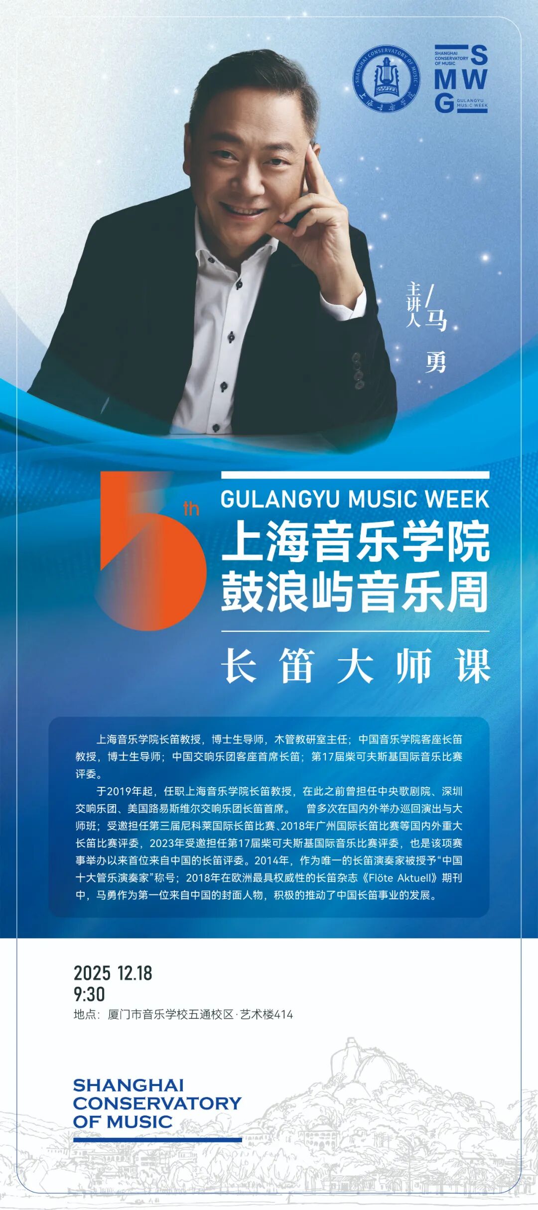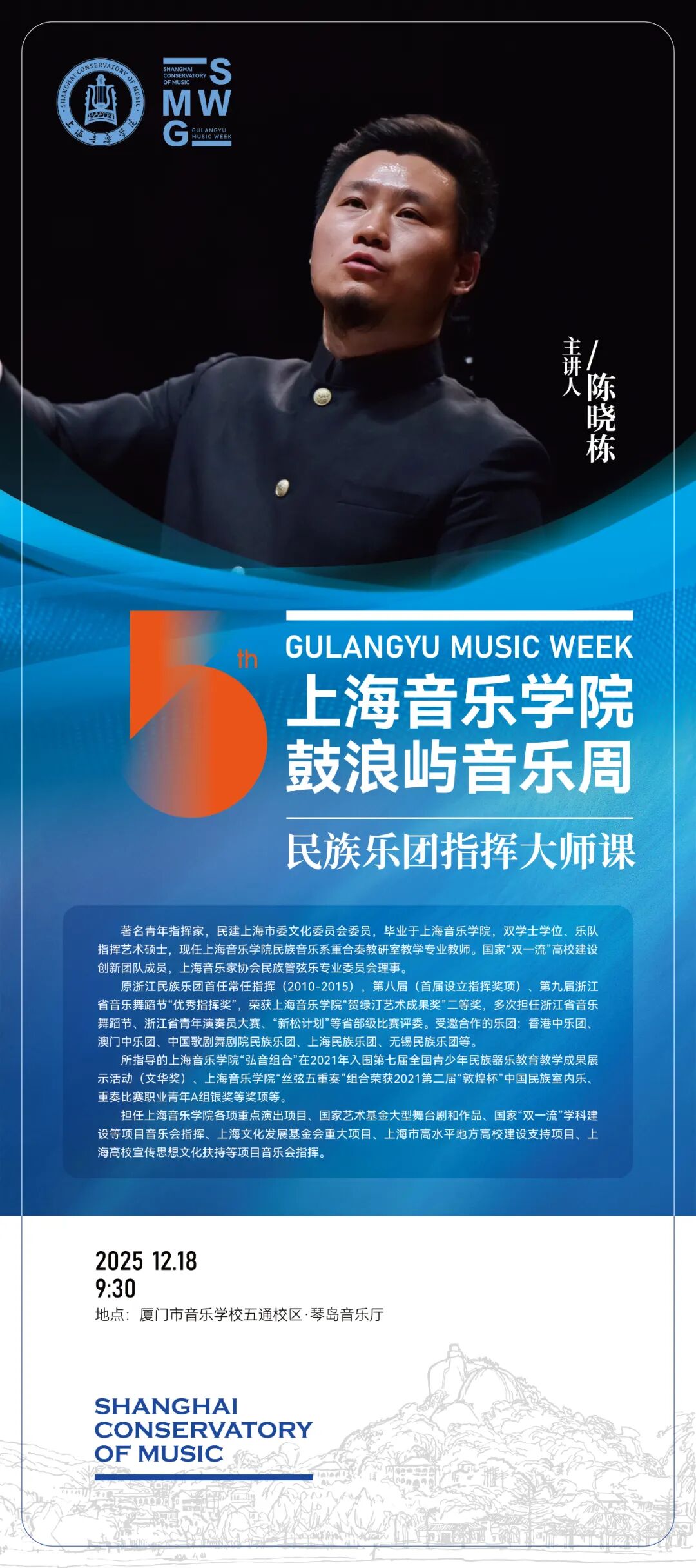 8场大师班汇聚上音顶尖师资力量,为厦门学子带来零距离的专业指导。上音钢琴系主任江晨教授、管弦系主任刘照陆教授、管弦系原系主任孙铭红教授、音乐教育系副系主任王海灵教授、青年指挥家陈晓栋等将举办系列大师班。单簧管演奏家陈坤教授、长笛演奏家马勇教授、圆号演奏家顾聪教授也将带来精彩的大师班与音乐会。