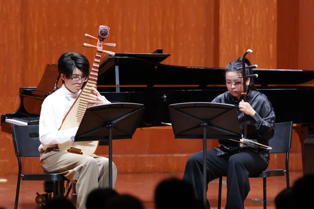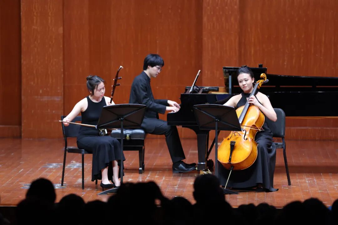 上半场还奏响门德尔松的《D小调钢琴三重奏》、勃拉姆斯的《A小调三重奏》等西洋经典曲目,以严谨的结构与饱满的情感,展现了古典音乐的永恒魅力。值得一提的是,作品《塞尔达传说》组曲与《云舒》均出自上音国际学生之手,将传统乐器与现代创作理念巧妙融合,充分展现出上音学生的艺术创造力。