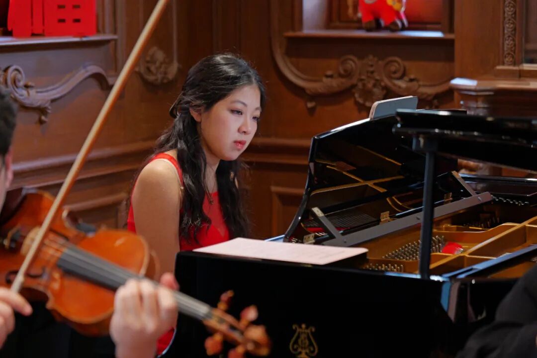 打击乐博士生张佳婧演绎的全新改编的马林巴版《草原英雄小姐妹》惊艳亮相,6分钟快慢快的精巧结构,以灵动之音演绎赤诚情怀,别样诠释经典魅力;钢琴研究生张新禾与室内乐团带来《春之声圆舞曲》,以钢琴与弦乐四重奏交织出维也纳圆舞曲的轻盈。