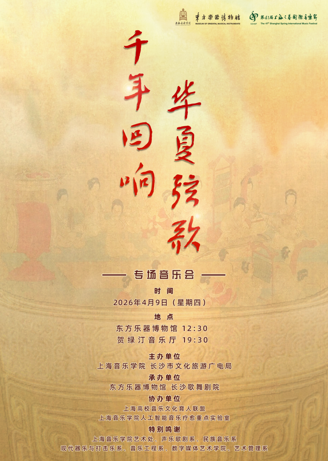 第十二届音乐开放周(4月5日-12日)涵盖公益演出、博物馆开放及文旅商体展融合;沪湘音乐家跨界联动“千年回响 华夏弦歌”4月9日),让古乐非遗焕发时代新生。