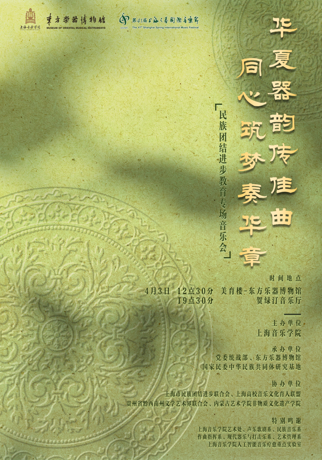 3月26日开幕式,廖昌永领衔上音师生,张国勇执棒上音交响乐团、上音合唱团及沪上多家专业院团,献演《红旗颂》、新时代版《长征组歌》《灯火里的中国》等红色经典;4月3日“民族团结进步教育专场音乐会”以多元音乐语言传递团结理念。