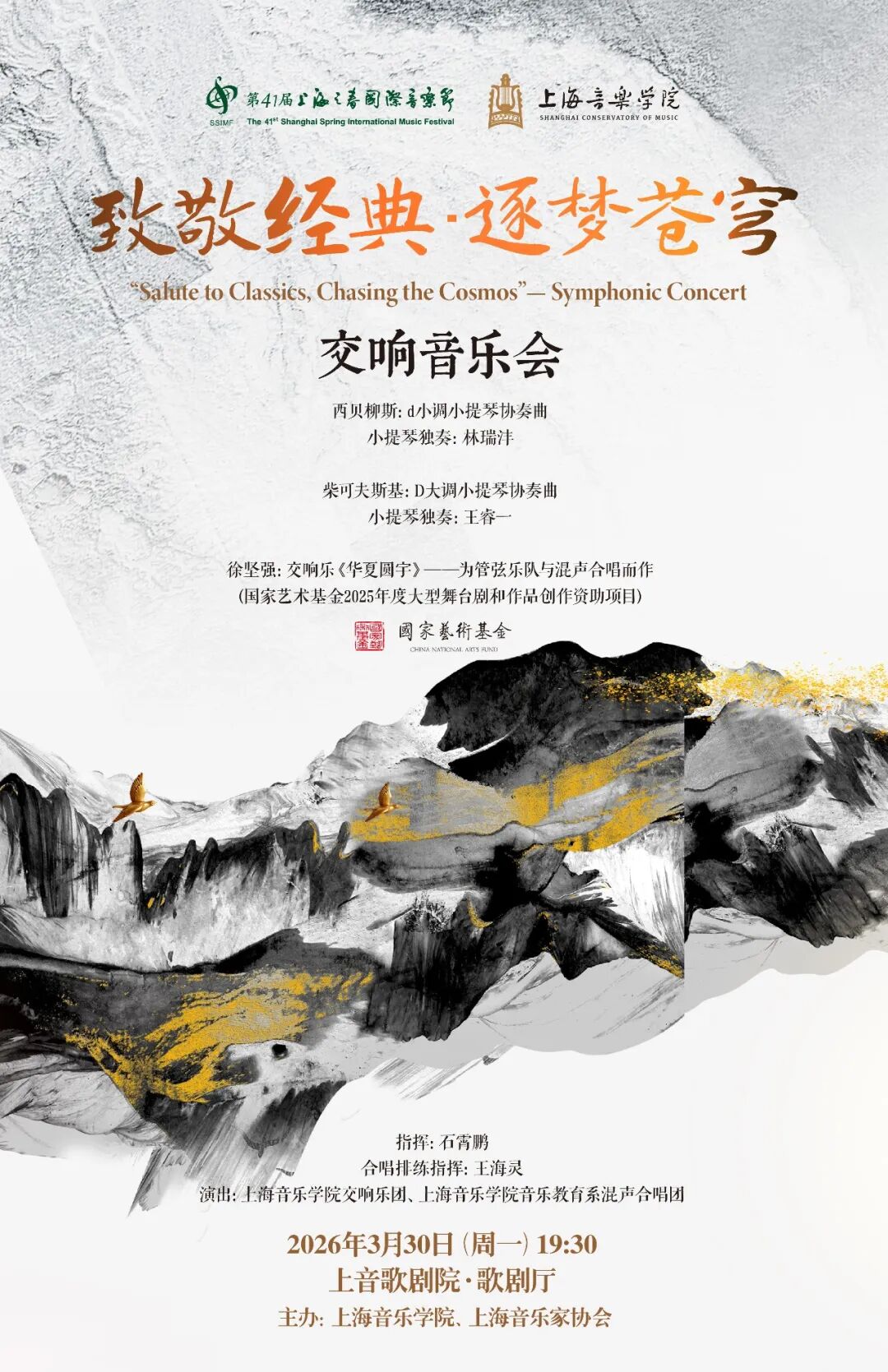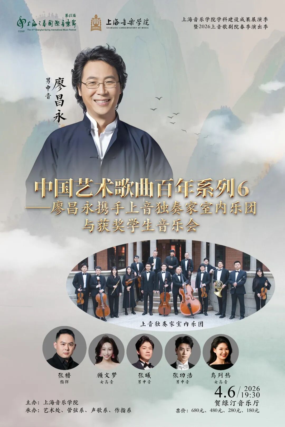 廖昌永携上音独奏家室内乐团与获奖学生献演“中国艺术歌曲百年系列6”(4月5日),上音连续六年品牌呈现,融音乐、诗词与书画于一体,展现中国艺术歌曲百年底蕴;“致敬经典・逐梦苍穹”交响音乐会(3月30日)聚焦经典与原创,其中徐坚强原创交响合唱《华夏圆宇》以恢弘旋律礼赞航天精神,彰显新时代文化自信。