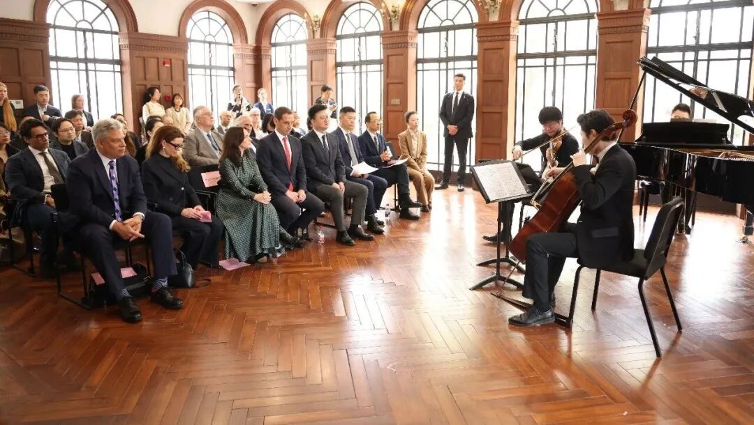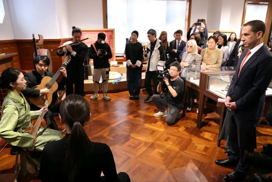 签约仪式后,来宾们观摩了小型演出。古筝独奏《高山流水》与棱境三重奏带来的施奈德《钢琴三重奏》,为现场嘉宾呈现了中西音乐艺术的交融之美。演出结束后,汤隽杰与冯磊陪同罗伟市长夫妇及大卫·斯图尔院长一行参观东方乐器博物馆,并观看贵州非遗乐器芦笙表演《迎宾曲》以及上音东方雅乐民族器乐弹唱组合表演的《祝福草原》,近距离感受中国传统音乐文化的独特魅力。